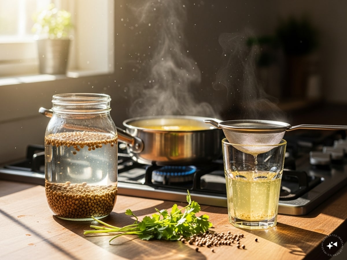1. রাতের প্রস্তুতি: 1 গ্লাস জলে 1 চা চামচ ধনে বীজ মিশিয়ে সারারাত ভিজিয়ে রাখুন।
