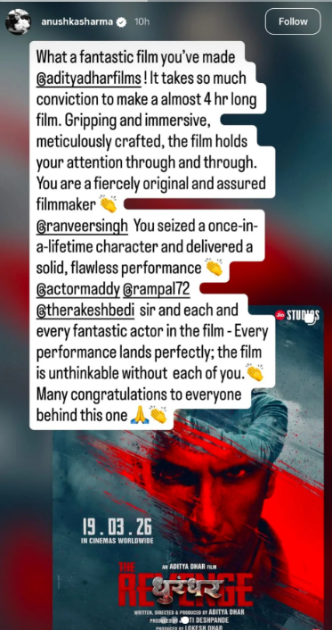 Anushka Sharma has reviewed the film Dhurandhar-2 from her official social media account and wrote, ‘What a wonderful film you have made, Aditya Dhar. It takes a lot of courage to make a film that is almost 4 hours long. This film is very interesting and will keep you completely engaged. Very finely made and holds your attention from beginning to end. You are a very original and confident filmmaker.