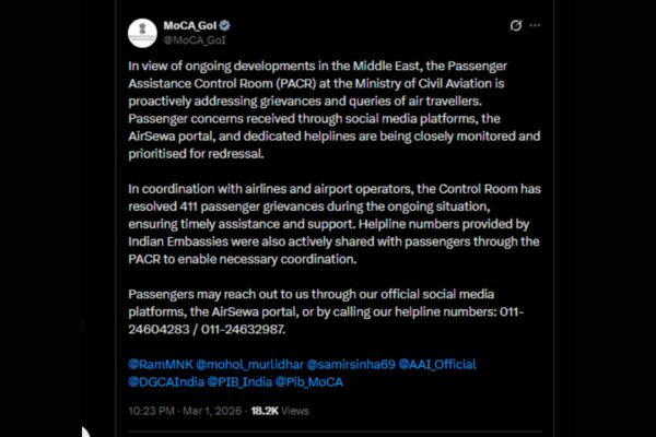 পশ্চিম এশিয়ার কিছু অংশ জুড়ে উত্তেজনা অব্যাহত থাকায়, ভারতের বিমান চলাচল কর্তৃপক্ষ ব্যাপক ফ্লাইট বাধার মধ্যে ক্ষতিগ্রস্ত যাত্রীদের সহায়তা করার প্রচেষ্টা জোরদার করেছে। বেসামরিক বিমান পরিবহন মন্ত্রক বলেছে যে তার যাত্রী সহায়তা কন্ট্রোল রুম (PACR) ক্রমবর্ধমান পরিস্থিতির দ্বারা প্রভাবিত বিমান যাত্রীদের অভিযোগ এবং প্রশ্নের সমাধান করার জন্য সার্বক্ষণিক কাজ করছে। বেসামরিক বিমান চলাচল মন্ত্রণালয়/এক্স কন্ট্রোল…