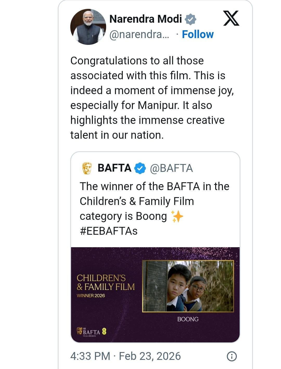 Manipuri language debut feature film ‘Boong’ has made India proud on the international stage. Congratulating the entire team of ‘Boong’, Prime Minister Narendra Modi posted on social media platform