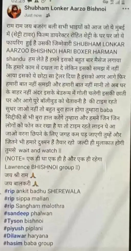 It is written in this post, ‘To all the brothers, we Shubham Lonkar, Arju, Hari Boxer, Harman Sandhu take responsibility for the firing that took place today at the house of film director Rohit Shetty in Mumbai (Shetty Tower). We messaged him many times asking him not to interfere in our work, but he did not understand. This small trailer has been given to it. If he doesn’t understand and listen to us again, then now instead of outside the house, he will be shot inside his bedroom, on his chest.