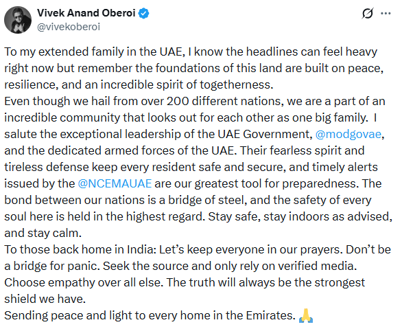At the end of his post, Vivek said, “I want to say to my people in India: Let us remember everyone in our prayers. Do not become a means of spreading panic. Trust only official and verified media for information. Give priority to empathy in all circumstances. Truth is our strongest shield. May peace and light reach every home in the Emirates, this is our wish.”